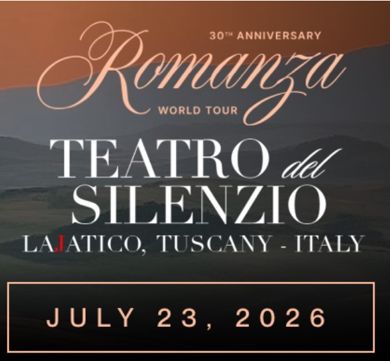 Em 23 de julho de 2026, o renomado Teatro del Silenzio em Lajatico será palco de uma noite única e imperdível, com Andrea Bocelli como atração principal em um evento especial que celebra o 30º aniversário de seu icônico álbum "Romanza", uma das obras mais influentes da história da música.